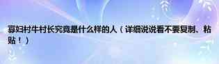 大家好,小方来为大家解答以上问题,寡妇村牛村长究竟是什么样的人,详细说说看不要复制、粘贴!很多人还不知道,现在让我们一起来看看吧!