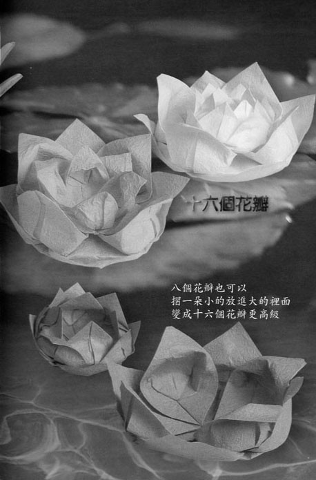 以一种纯白的正方形折纸开始,如圆向中央折,再向中央折,然后翻到背面,再向中央折,这样周全的四角就出来了,如圆把背面一个角拉出来,用手细致捏出花瓣摸样儿,其他三个角依次细细如旧拉出来捏出花瓣来,上面一层四角拉出捏成花瓣以后再如是拉出另外四只角,这样一朵盈盈的八瓣睡莲出来了。